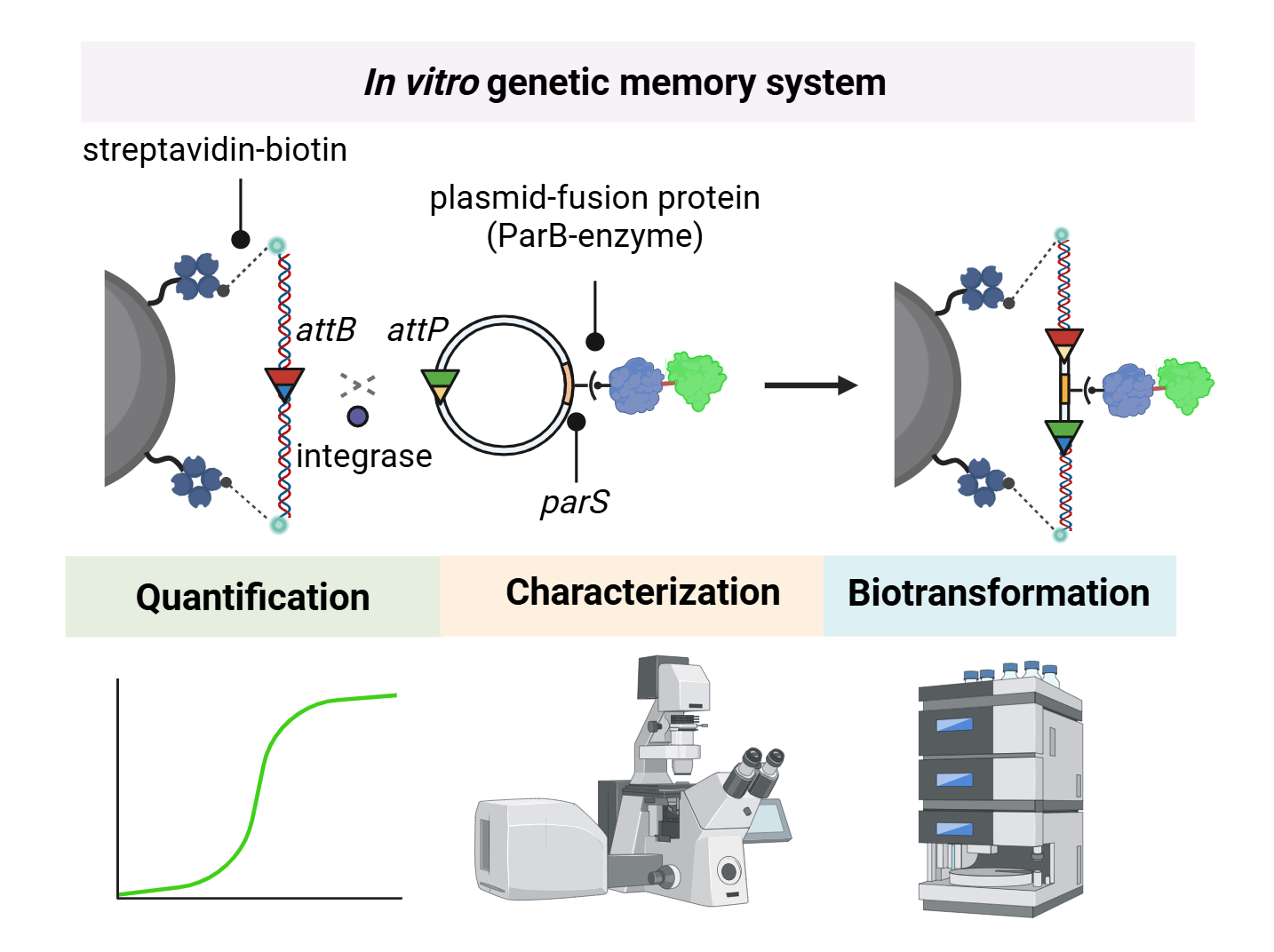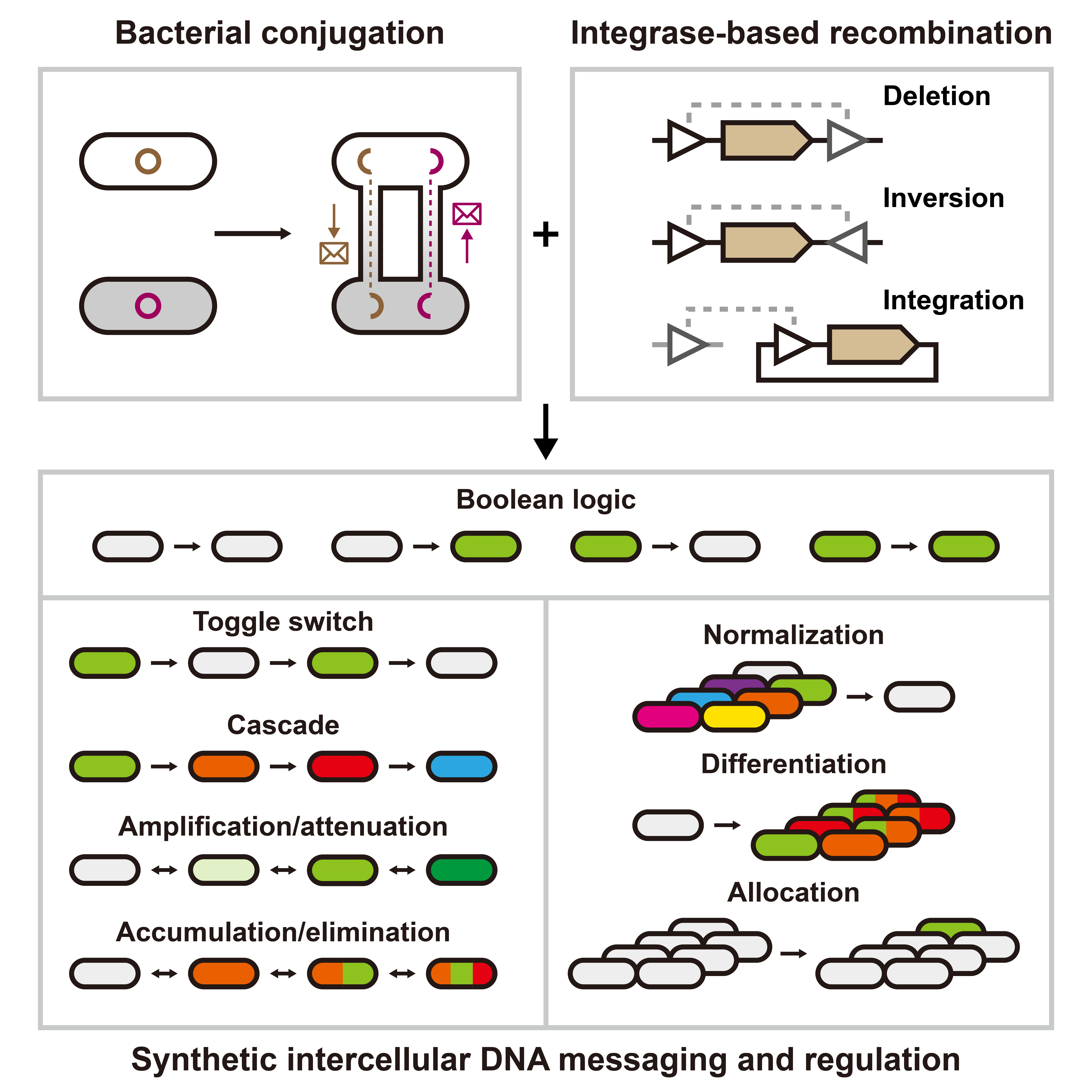 In this work, we present a versatile strategy for integrase-mediated intercellular DNA messaging and regulation, combining bacterial conjugation-based horizontal gene transfer with programmed genetic circuits. This approach enables DNA messaging, logic processing, and phenotype modulation in hierarchical E. coli strains, offering new avenues for microbial community programming. This work was published on Cell Systems Link.
