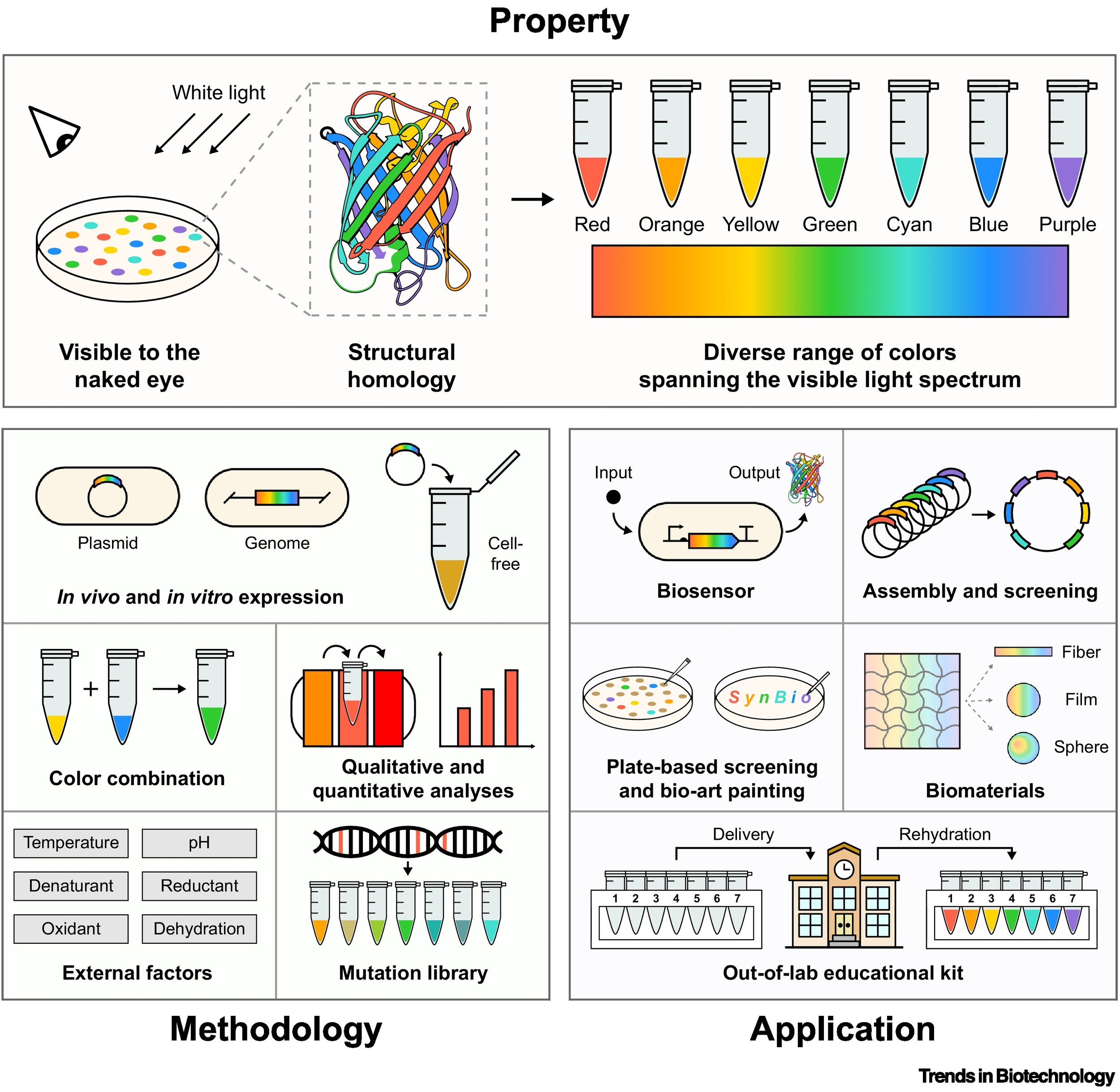 In this Opinion article, we provide a comprehensive overview of recent progress in chromoprotein-based research related to synthetic biology, highlighting their physicochemical properties, detailed classification, engineering strategies, and emerging applications. This paper was published on Trends in Biotechnology Link.